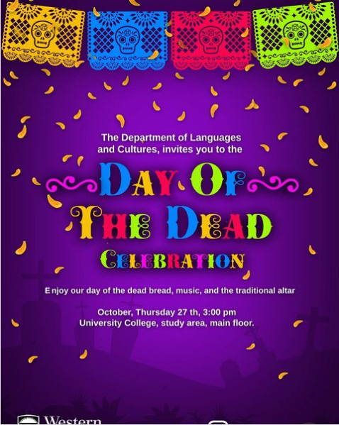 El departamento de Idiomas y culturas de la Universidad de Western Ontario estará celebrando el dia de manana (Jueves 27 de octubre 2022) el Dia de Muertos. El evento sera de 3:30 pm a 5:30 pm en el Conran Hall ( UC3110) y Habra musica, comida y lecturas. El evento es gratis y para todo el público , pero requiere reservacion.